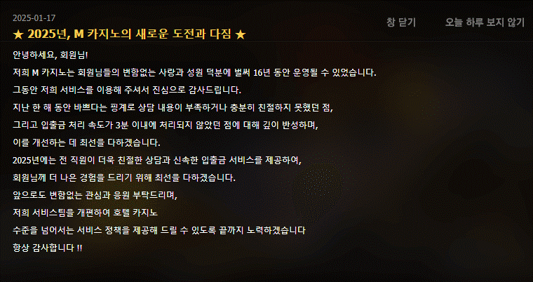 앞으로도 M카지노 커뮤니티는 여러분의 소중한 의견을 반영하여 더 나은 방향으로 나아가겠습니다. 엠카지노도메인